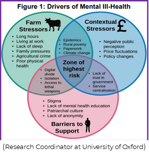 Other drivers of mental health are Farm Stressors, Contextual Stressors and Barriers to Support shown within the diagram, which illustrates how different types of factors intersect to increase risk. Factors can be intrinsic to farming or contextual.